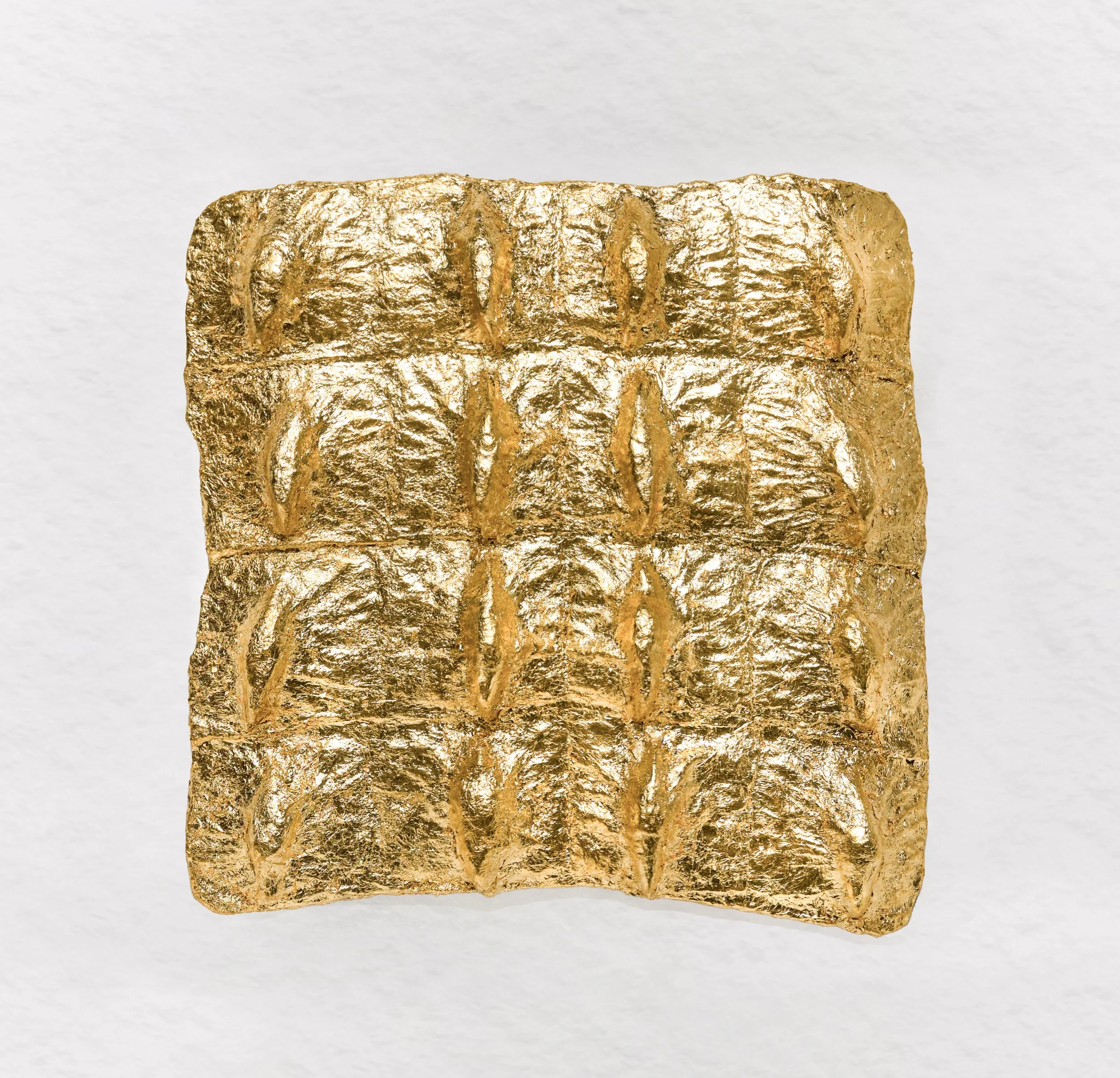 This self-referential twist mirrors the very logic at play in the luxury industry, where crocodilian skins, sourced from farms, paradoxically contribute to the preservation of the species they exploit. This uneasy transaction blurs the boundaries between preservation and commodification. Series of 15. Porcelain plaster + gold leaf finish. 21 x 21cm.